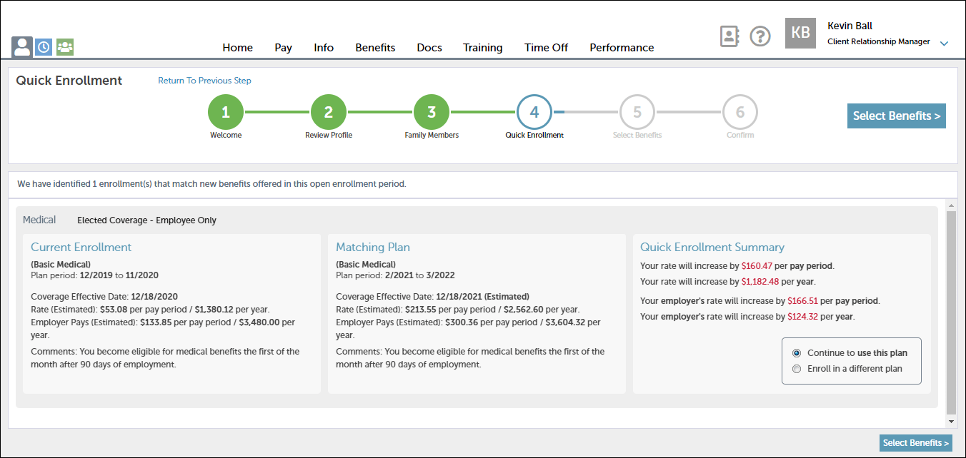 Quick Enrollment is a step during the open enrollment process. During this step, employees will see side-by-side information related to the cost comparison from the current and new year plans for the same coverage. Employees can then elect to keep the same coverage or review other plans to manage their benefits costs more effectively.